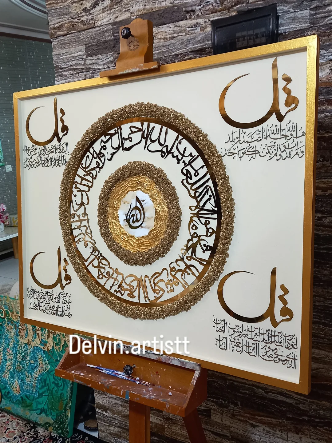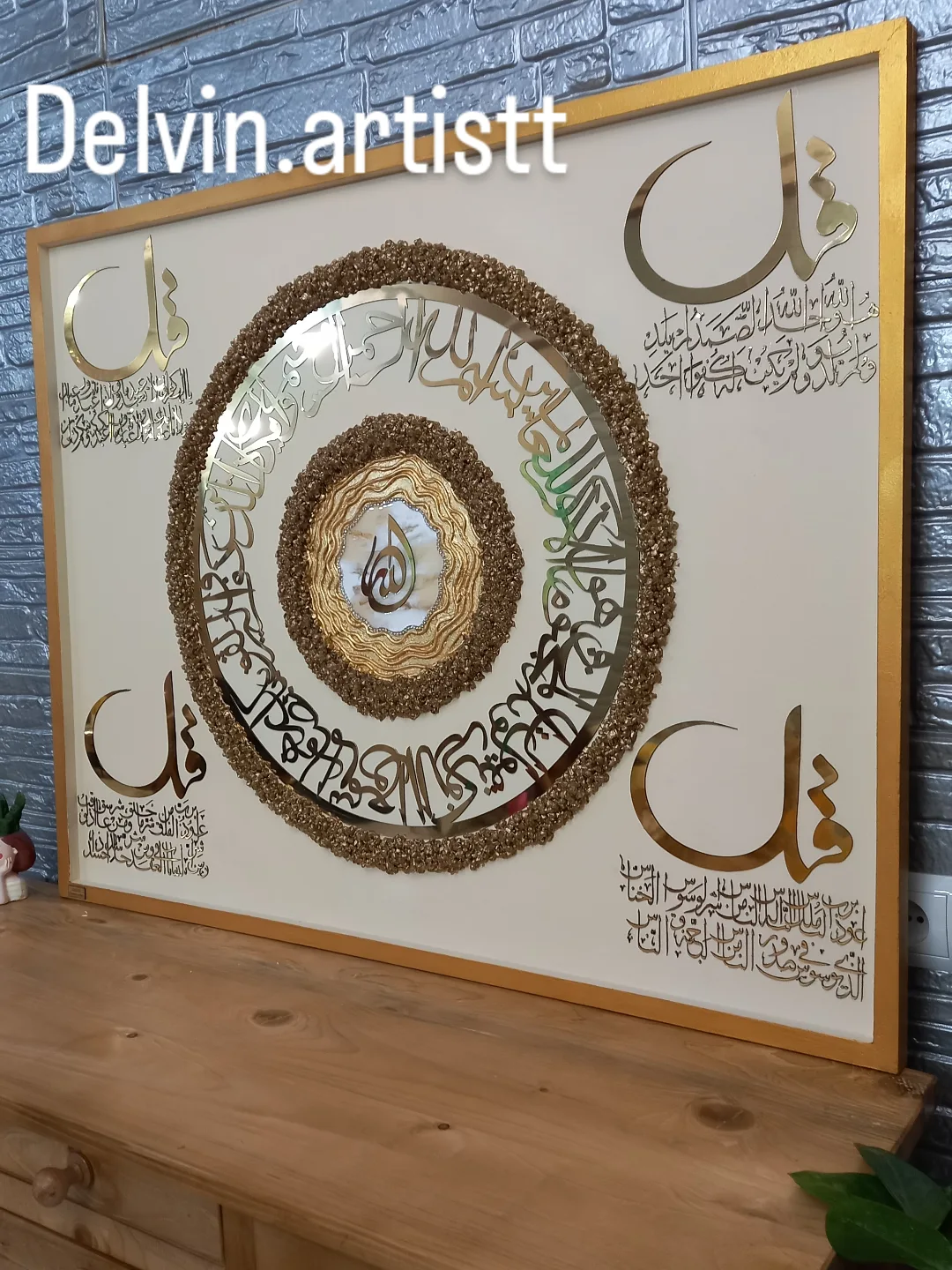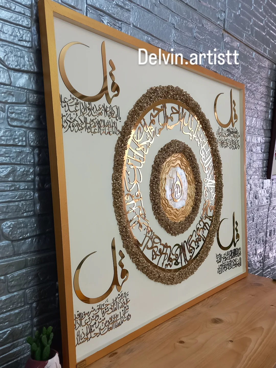 تابلو ۴قل اجرا شده روی شاسی چوبی دور کلاف دار ،جنس آیات مولتی استایل خارجی، کریستال ژئود و رزین کره ای ،ورق طلا کار شده سایز با قاب دور کار ۸۰در۱۰۰