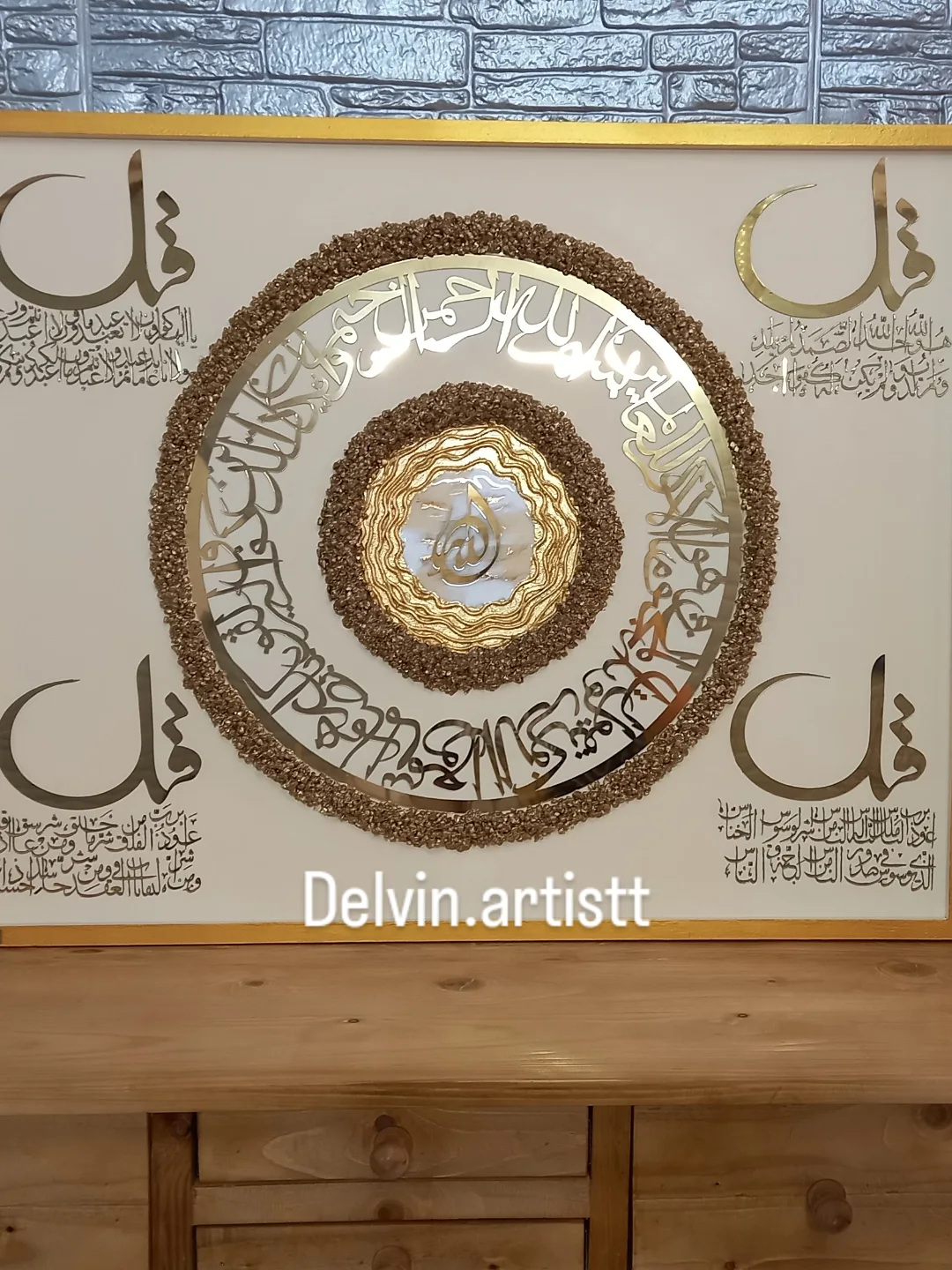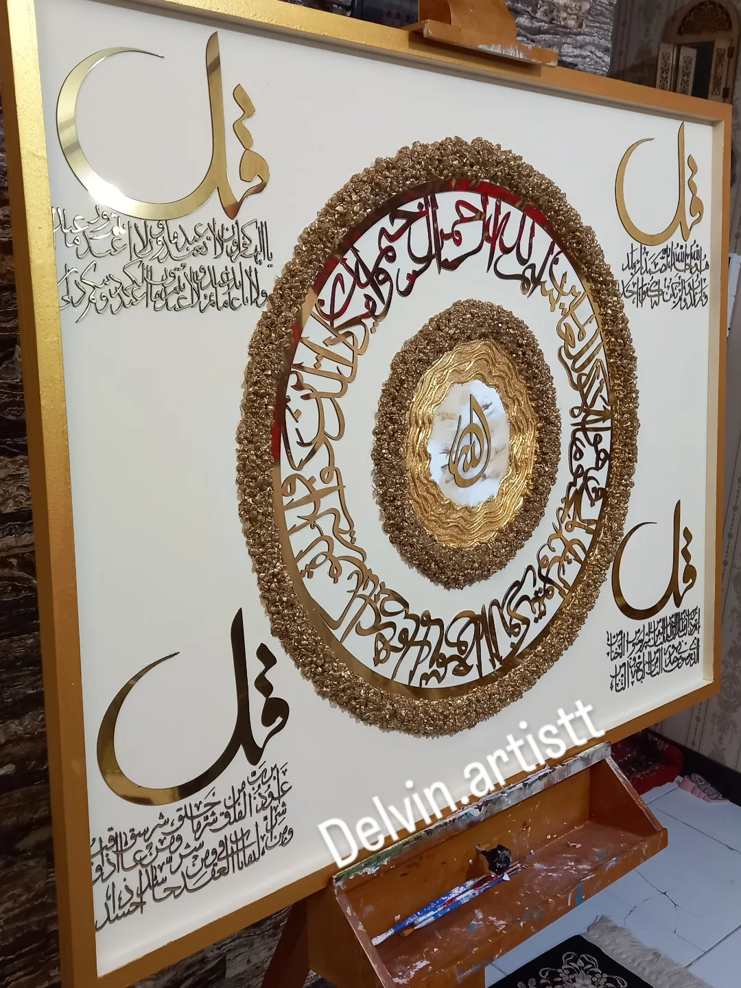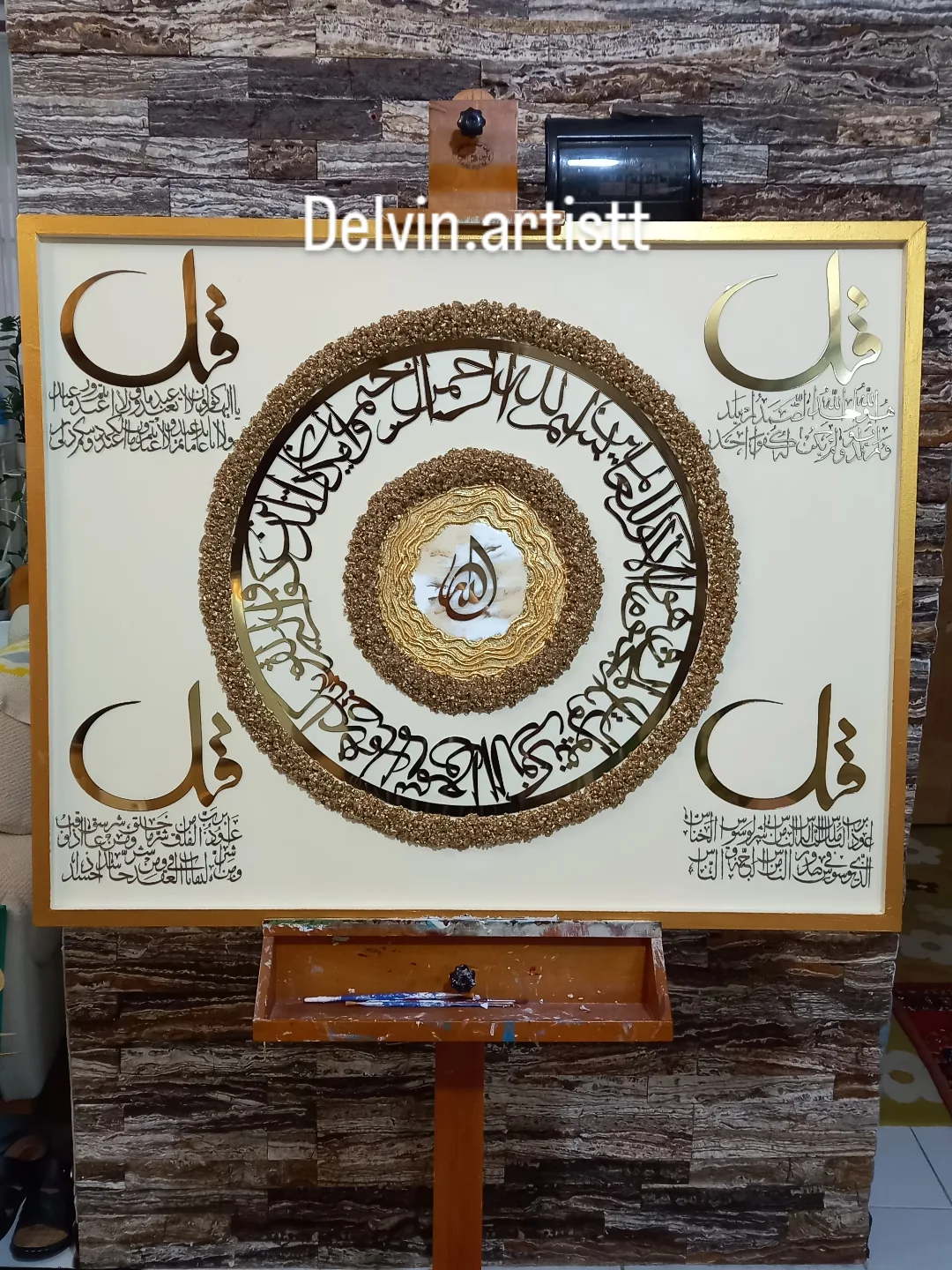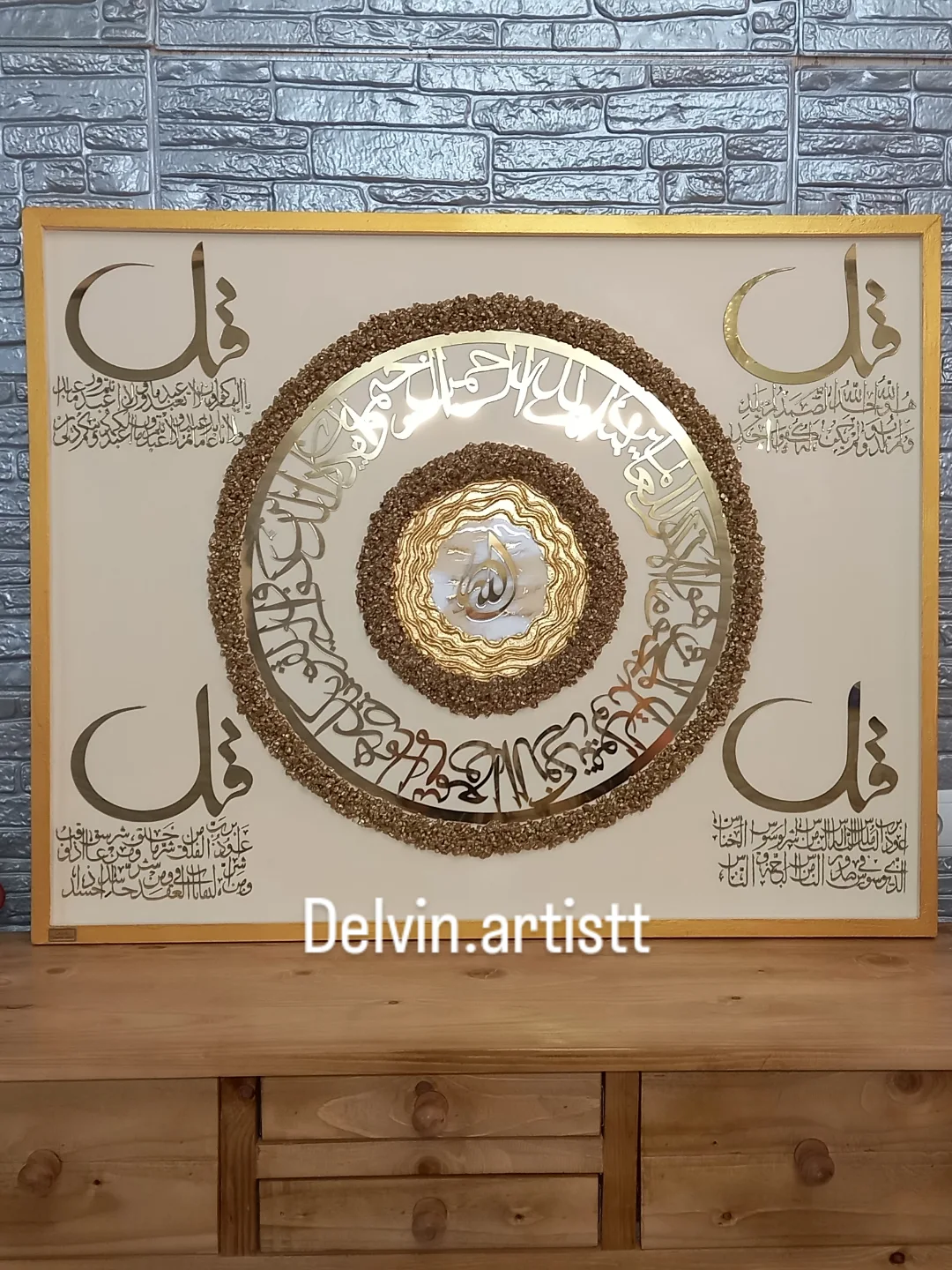 تابلو ۴قل اجرا شده روی شاسی چوبی دور کلاف دار ،جنس آیات مولتی استایل خارجی، کریستال ژئود و رزین کره ای ،ورق طلا کار شده سایز با قاب دور کار ۸۰در۱۰۰